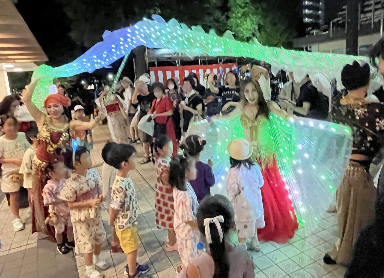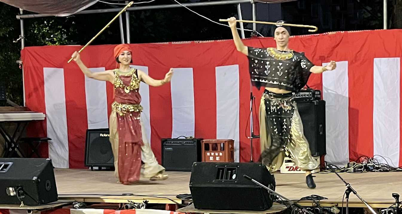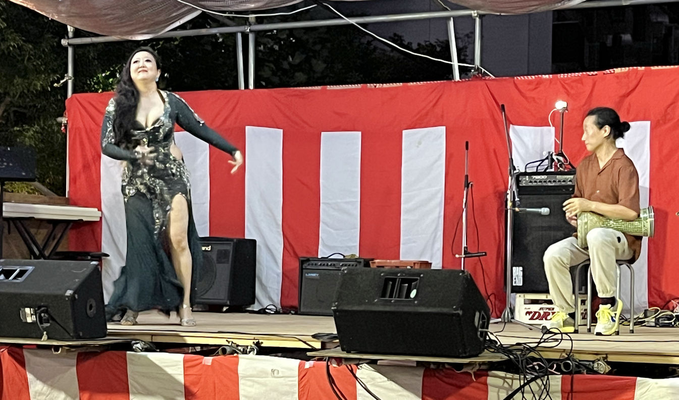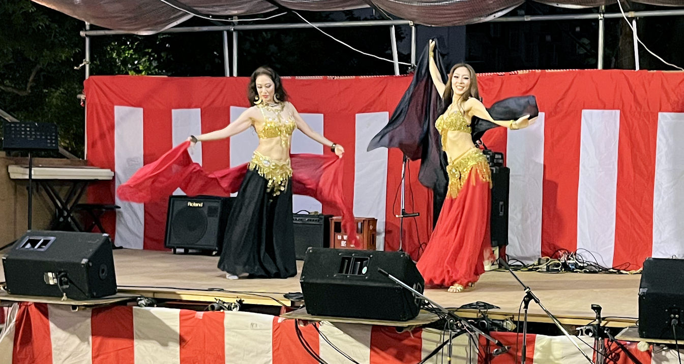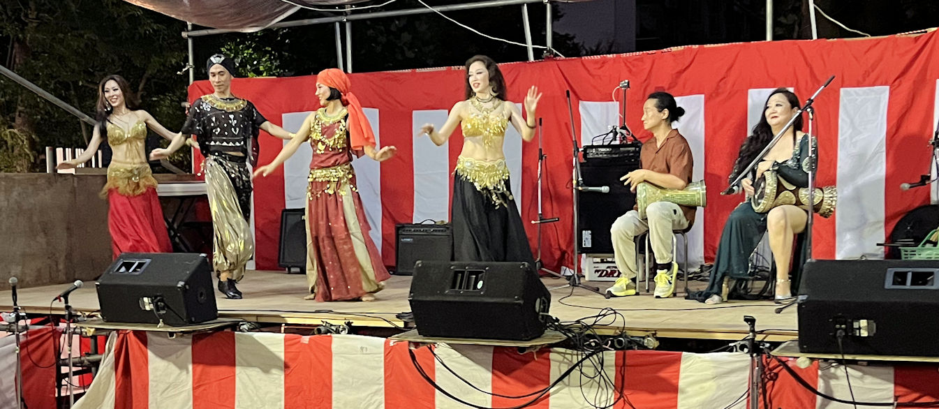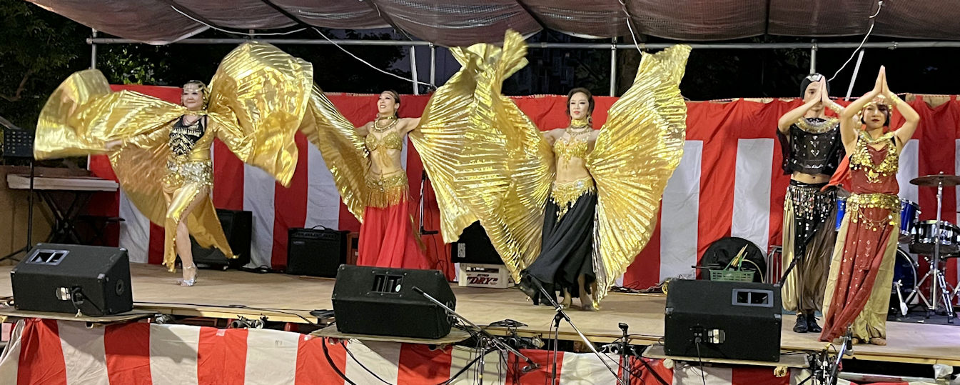 サリソンベリーダンスです。総勢5名のダンサーが踊り、アラブのタイコの「ダルブッカ」の生演奏を披露します。 ベリーダンスは古代エジプト発祥で世界最古の踊りと言われ、紀元前からある歴史の深い踊りです。ベリーダンスが世界に渡り、オリエンタル、ジプシーなど様々なスタイルが生まれました。 その歴史を感じるベリーダンスをお楽しみください。今回は、40回を迎えたゆりの木夏まつりに出演すべく、大阪からダルブッカ王子ことモリウチ キヨタカさんも駆けつけてくれました! 最後まで楽しんでいただけるよう、みんなでがんばります!