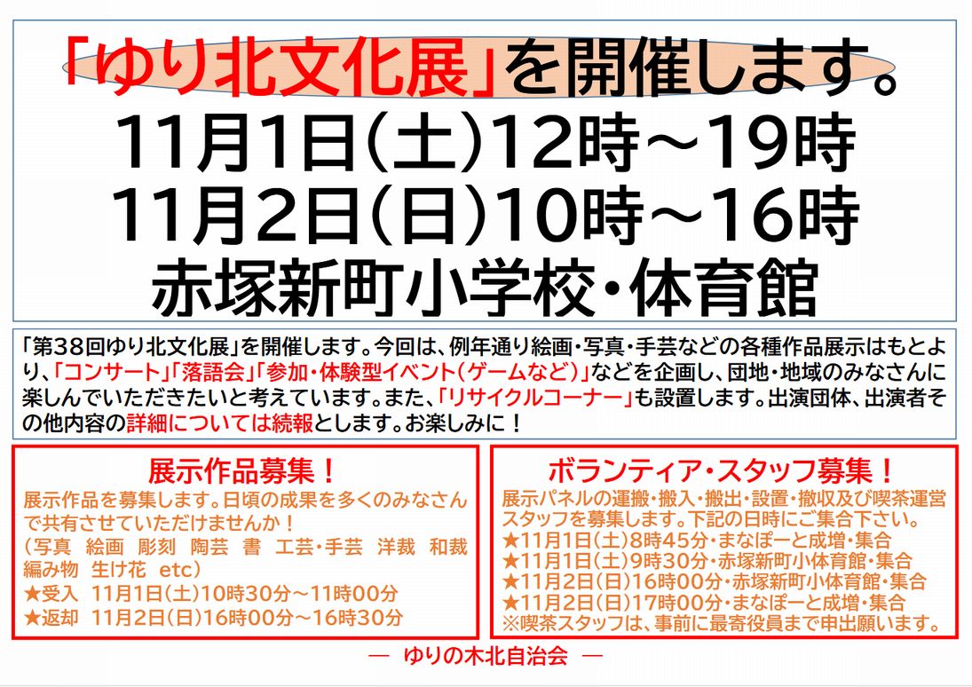 11月1日(土)・2日(日)赤塚新町小学校体育館にて恒例の文化展を開催します。住民の皆さまのアートな作品の展示、素敵な音楽、恒例となった大人気の落語など様々な芸術に触れる2日間をお楽しみください。