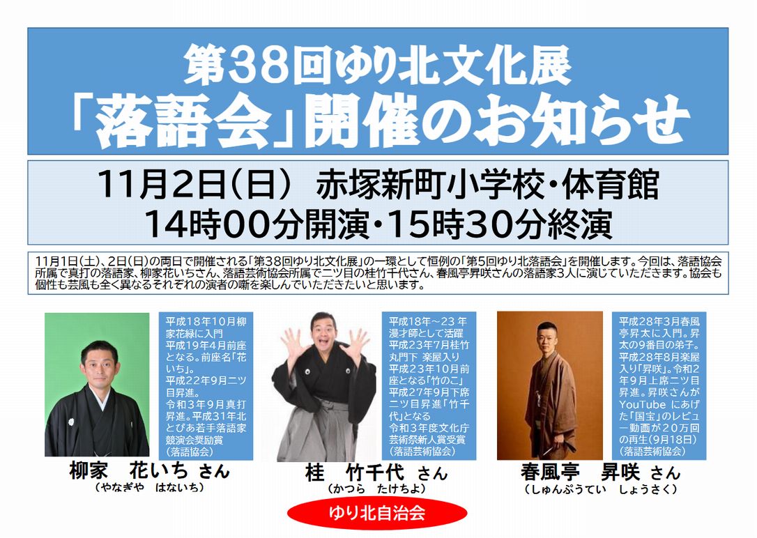 楽日の落語会には地元出身、大人気の春風亭昇咲さんをはじめ、今年は真打ちの方、来春真打ち昇進予定の方と超豪華な顔ぶれとなっております。ぜひお楽しみに。